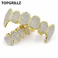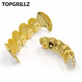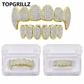 TOPGRILLZ Hip Hop Gold Color Plated Teeth Grillz Caps CZ Micro Pave Exclusive Luxury Top&Bottom Gold Grillz Set Ship From US