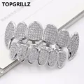TOPGRILLZ Custom Fit Gold Silver Color Iced Out Hip Hop Teeth Grillz Micro Pave Cubic Zircon Top & Bottom Teeth Grills Set