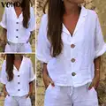 VONDA 2 Piece Sets Women White Lace Tops + Pants 2020 Summer Women Suits See Through Blouse Party Beach Hollow Blouse S-5XL