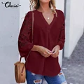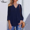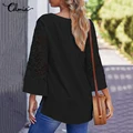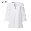 Limited Price Women White Blouse Celmia Summer V neck Lace Shirts 3/4 Sleeve Sexy Hollow Out Tunic Tops Casual Lo with FREE Shipping Worldwide!