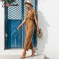 Discount Price Conmoto solid summer beach women jumpsuits romper casual button lace up wide leg jumpsuit long pock with Free Worldwide Shipping!