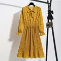 New Spring summer Dress Women Bow Floral Long Sleeve Polka Elastic Waist Leopard Pleated Collar Vestidos Robe Femme clothes 2020